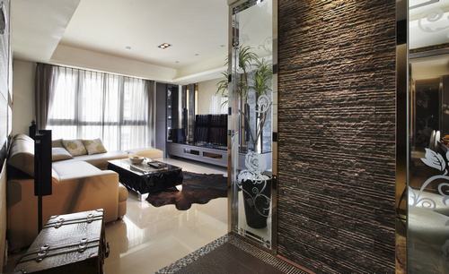裝修TIPS:玄關大膽采用天然石材居中陳列成為視覺焦點,兩側屏風為玻璃穿透性質,鞋柜門片佐以茶鏡,有效放大反射空間。