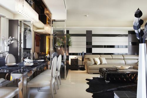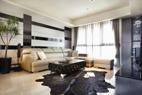裝修TIPS:客廳沙發背墻用黑鏡、木皮和皮革交迭出利落時尚的線條。