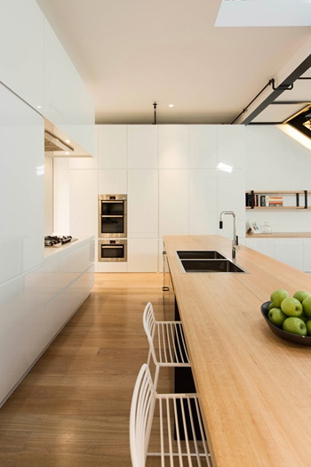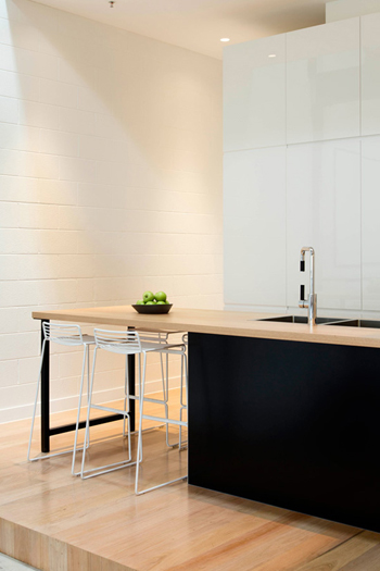 天花板上的橫梁不僅有承重的作用,還巧妙地與臺階共同起到分隔空間的作用。L型的櫥柜設計在避免了墻壁的單調的同時,延展了空間的視覺效果。