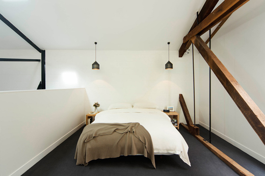 天花板傾斜設計,提高空間利用率,騰出閣樓位置,增添空間的立體感。拉長式吊燈設計巧妙裝飾天花板,挑高空間視覺效果,彌補空間因閣樓而矮小的缺憾。