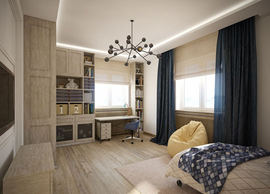 采用木質(zhì)的陳列架增加空間的收納功能,九宮格圖案的床頭背景墻增添了空間立體感和古典藝術(shù)氣息,此外還與紫羅蘭色的窗簾相融合。