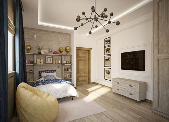 設(shè)計(jì)師采用多個(gè)陳列架組合收納空間,不僅節(jié)省空間,提高空間的收納功能。整體實(shí)木設(shè)計(jì)散發(fā)著濃郁的鄉(xiāng)村氣息,放射式吊燈造型則無(wú)形中增添了空間的活潑和靈動(dòng)性,與窗戶一起起到提亮空間的效果。