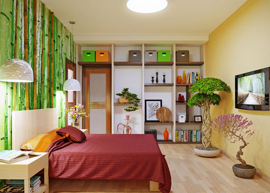 綠色竹子圖案的床頭背景墻,大紅色被褥,米黃色壁紙,木質(zhì)地板,綠色盆栽,各種顏色碰撞一起,形成強(qiáng)烈的視覺(jué)沖擊力,展現(xiàn)青春活力空間。多個(gè)格子陳列架的混合色彩搭配,不僅巧妙地裝飾了墻壁,還盡顯空間的收納功能,整體給人青春時(shí)尚的視覺(jué)效果。