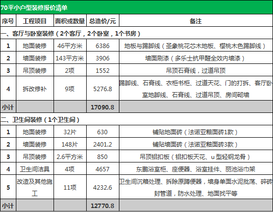 70平米小戶型二手房室內裝修報價清單和室內裝修報價表: