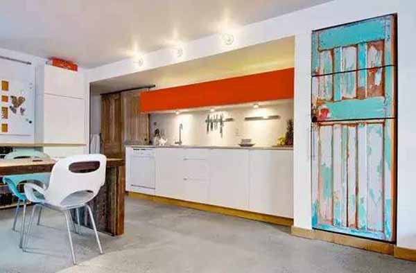 4)在白色背景下添加彩色。沒有窗戶的房間感覺非常壓抑。為了抵消這種效應可以通過增亮空間,并添加顏色鮮艷的高光墻壁。下面這間地下室廚房,從橙色的櫥柜和寶藍色大門中收獲了興奮。明亮白色的墻壁,也有助于在房間里投射光線。