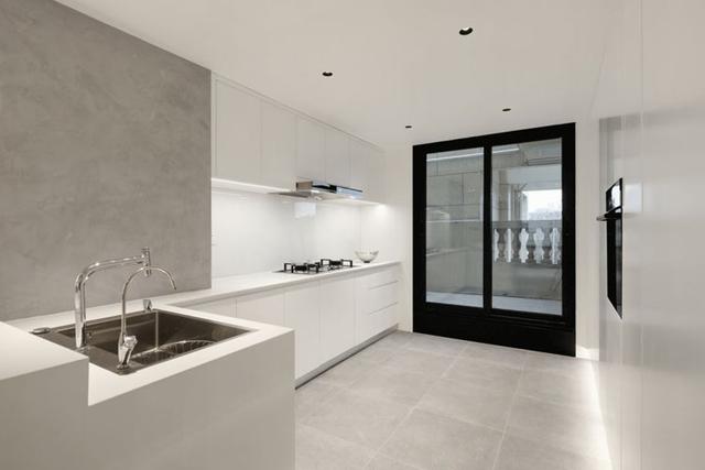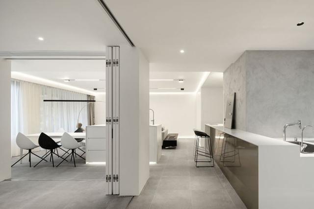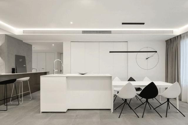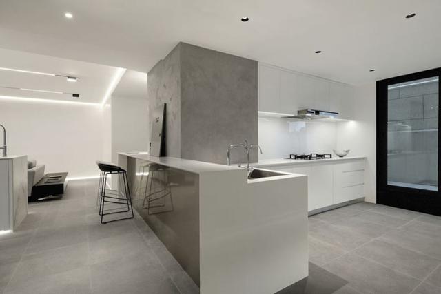 在玄關的背面,便是廚房了,其將吧臺與櫥柜整體進行連接,并保留了原本的極簡設計,以白色的櫥柜和金屬飾面相互搭配,盡顯整潔。