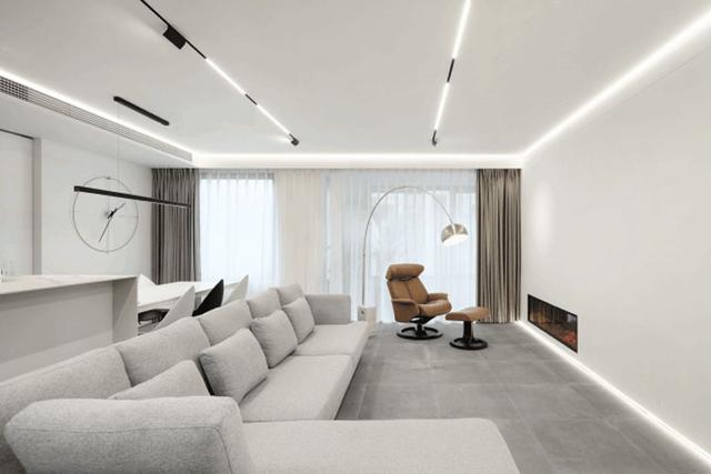 行至客廳,又是另一幅光影交織的畫面,大大的落地窗搭配頂部和底部的燈帶,充分渲染出了空間的明亮感,再加上淺灰色的沙發和一個搶眼的釣魚落地燈,瞬間提升了室內的藝術氛圍和設計感。