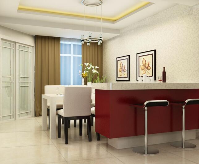 與客廳合并的餐廳比較好布置,這種格局的餐廳裝飾性重于機能性,以美觀為主,同時這里的主空間是客廳,餐廳的裝修格調必須與客廳統一,否則兩個相連的空間會給人一種不協調的感覺。以上兩種與其它空間合并的餐廳都存在一個隔斷形式的問題,根據隔斷形式可分為半開放式和開放式。用透空架柜、便餐桌和出菜口等半開放的隔斷,是最理想且又適合普通家庭的設計,這樣可以最大限度地利用空間,迅速地傳遞飯菜。常見的設計是在工作臺外連一個略矮一點的便餐桌。不過需要注意的是,在狹小不甚寬敞的空間里,盡量防止視線的阻礙,以便給人一種寬敞明亮的感覺。餐廳與客廳的隔斷可采用藝術隔斷,在造型上多下功夫。