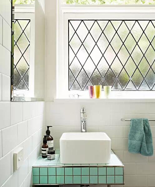 空間形狀不規(guī)矩,或者說可用空間形狀比較特殊時,自然要用更特俗的手段來應對。這款臺盆實際上一個壁掛式臺盆,但如果不能接受它外觀裸露的凌亂感,那么就用這個交錯的水泥擱板來進行一些小小的“硬裝飾”,綠色瓷磚和銀色鑲貼線是一個很適合年輕女孩的配色,為這個空間增色不少。