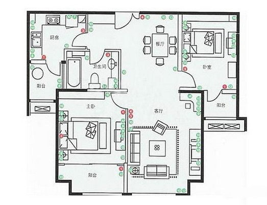 (3)其余部分:空調一個(16a插座)空調放置相對位置,電話插座一個(沙發背后),麻將機、電熱片、火爐、落地燈,至少一個九孔插座,位置沙發背后,原則盡量看不見且方便拖插線板,因為不可能所有東西都直接插墻上。