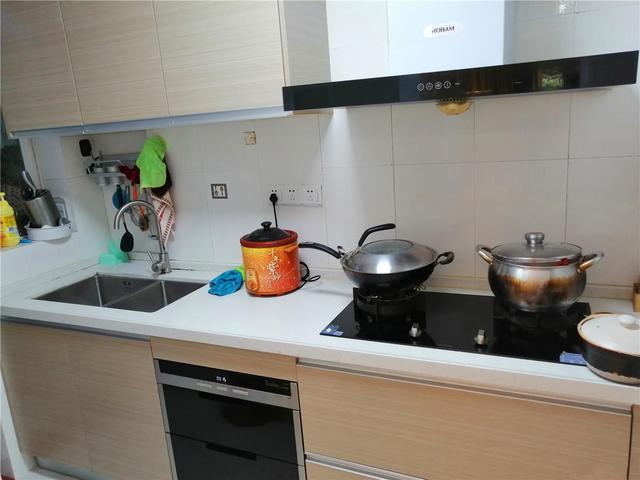 廚房的櫥柜是素雅的原木風格,搭配白色的臺面,整體很清爽。另外大陽臺也是非常喜人的,正對小區的花園,而且陽臺又大啊。