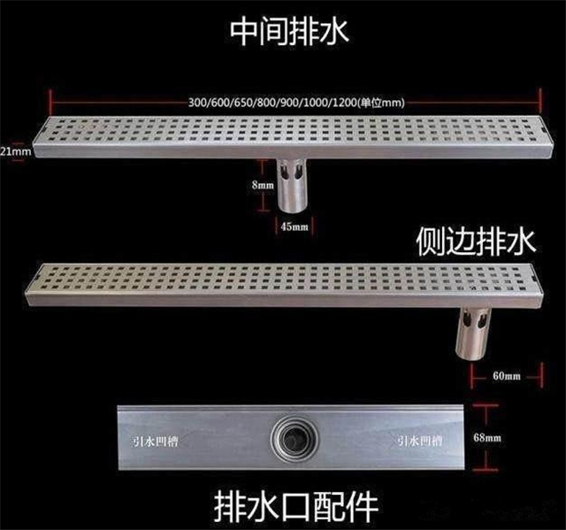 雖然說長條形地漏的規(guī)格很多,可以從300-1200mm不等,但首先要要注意的是長條形地漏分為中間排水和側(cè)邊排水這兩種情況,購買時一定要進(jìn)行精確的測量,然后看看自己家適合哪一種,哪個規(guī)格。