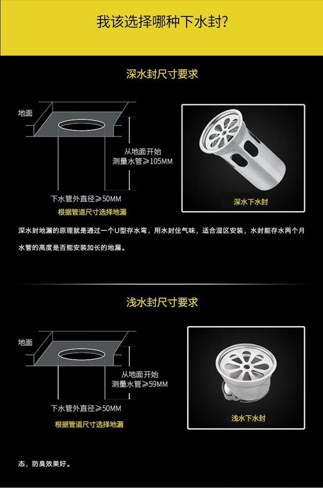 從上圖也可以看出,購買長條形地漏時,一定要先測量一下衛(wèi)生間地漏排水管的深度,看看適合安裝哪一款水封: