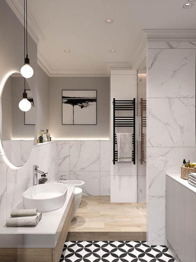 衛生間裝修也很摩登時尚,黑白相接的地磚,搭配灰色紋路的墻磚,起到很好的色彩點綴效果。圓面的鏡子不僅增加了柔和性,對空間起到了視覺延伸效果。