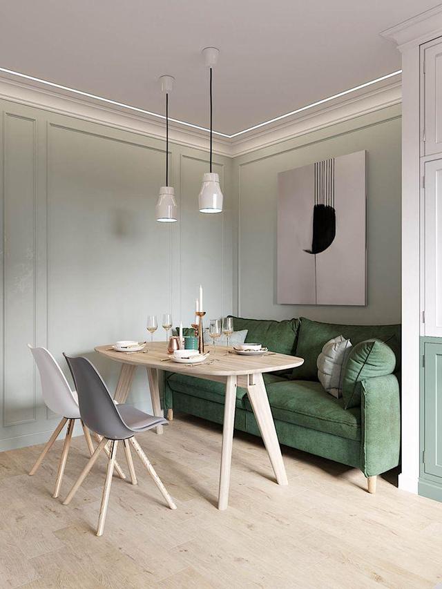 湖綠色的布藝沙發摩登又具有復古氣息,與櫥柜的綠色搭配顯得相得益彰,色彩相互呼應,給人一種柔和又淡雅的美感。另外,餐廳和廚房之間通過花紋地磚和原木色地板作為區分,不僅沒有覺得突兀,反而還增加了摩登時尚感。