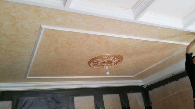 釘釘子之后,最后是收邊,把多余的快粘粉清理干凈,基本上石膏線就安裝成功了。