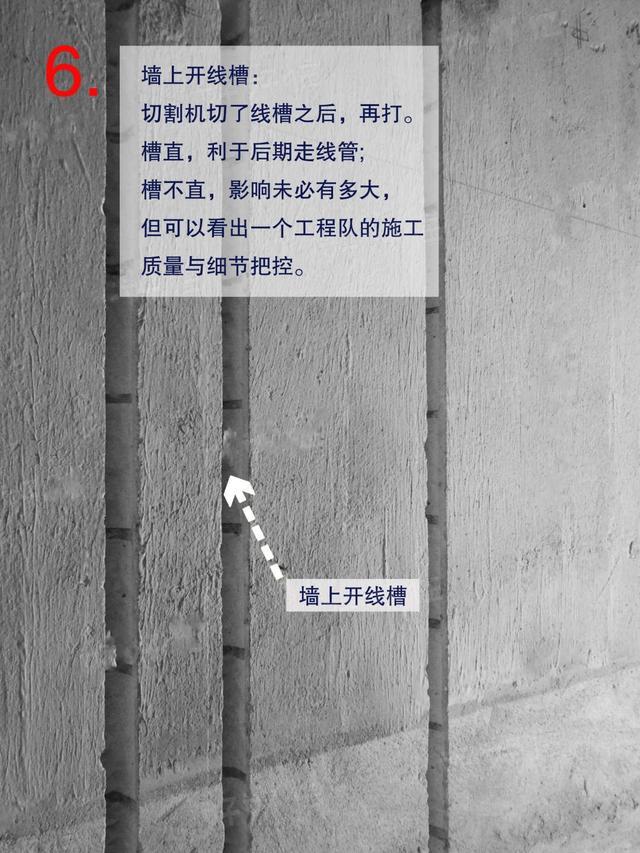 一般開槽是由切割機(jī)切了線槽之后再進(jìn)行打。線槽工整平直,才有利于后期的線管走線,開的槽如果雜亂或者不齊直,說明施工水平有問題。這里就可以看出一個(gè)裝修公司對(duì)于施工的細(xì)節(jié)和品質(zhì)的把控了。