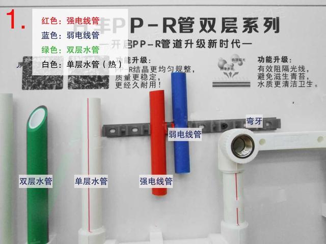 大家都知道電線管分為強(qiáng)電和弱電兩種,劃重點(diǎn):市面上一些品牌的強(qiáng)電線管是紅色的,藍(lán)色線管是藍(lán)色的,建議選用這種,施工時(shí)各種線路七零八落,紅藍(lán)線管易于區(qū)分,后期也便于區(qū)分檢修。同樣的,水管有冷熱水管之分,也有單雙層之分。