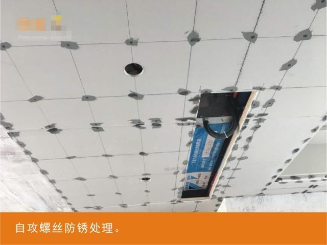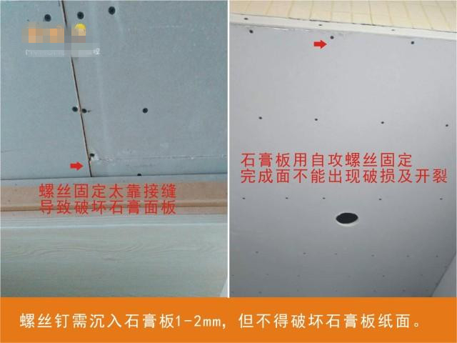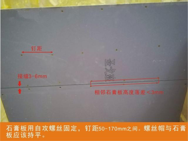 4.注意螺絲釘的處理:不能太靠近接縫、不能凸出石膏板。目的是防止石膏板破裂以及后期面層出現起鼓等情況。
