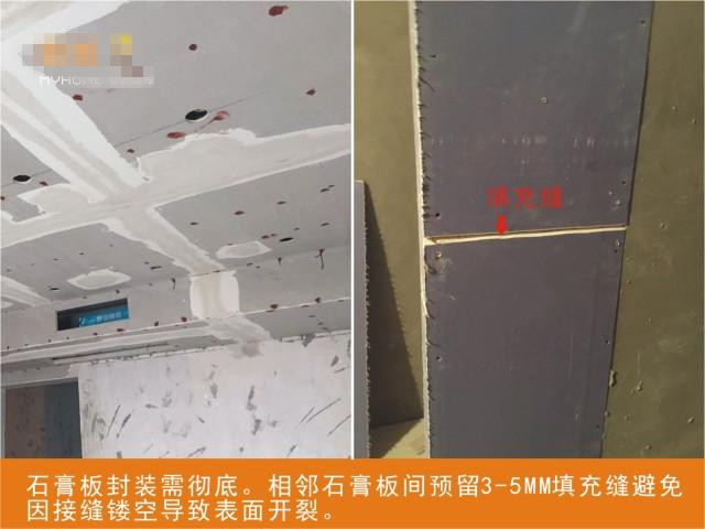 2石膏板與石膏板之間的收縮縫的大小,以及收縮縫的處理非常重要。收縮縫大小在3-5mm最好。太寬,由于填縫石膏用量過多,容易開裂。過窄,伸縮距離不夠,膨脹擠壓也會導致開裂。