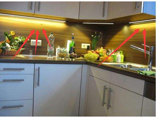 6.廚房里光是一個集成照明是不夠的,很多地方都會被人或者物體遮擋,燃氣灶和水槽,操作臺都可以安裝一些燈帶等照明!