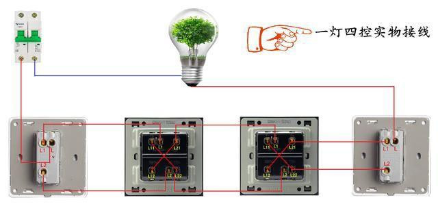 四個(gè)開(kāi)關(guān)控制一盞燈:大家看四控與三控最大區(qū)別就的中間有兩個(gè)多空開(kāi)關(guān),如果我們要接9個(gè)開(kāi)關(guān)控制一盞燈,那么兩邊開(kāi)關(guān)三開(kāi)雙控,中間加單開(kāi)多控就可以,無(wú)論多少控制就多加幾個(gè)多空開(kāi)關(guān)。