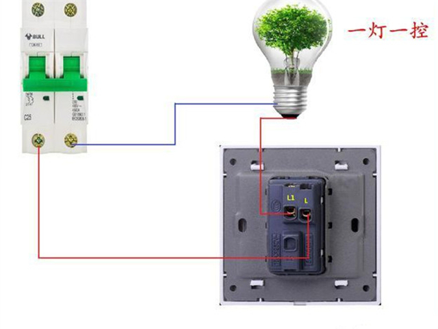 一個(gè)開(kāi)關(guān)控制一個(gè)燈:大家看斷路器是兩相的,所以一根線去燈,一根線去開(kāi)關(guān)。(這里說(shuō)明無(wú)論幾控開(kāi)關(guān)控制火線)。