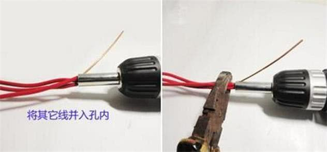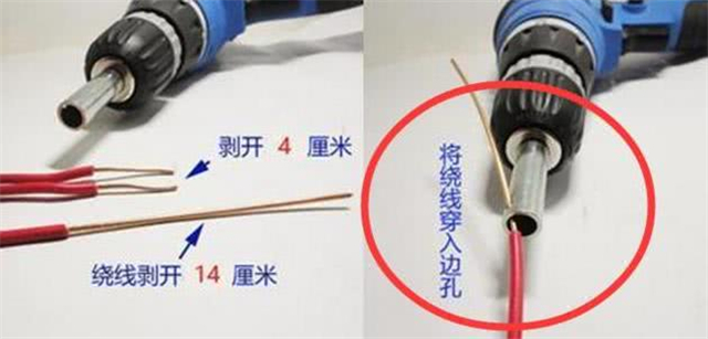首先將電線底端剝皮4厘米,然后將用來繞的那根額外剝長一些到14厘米左右,然后將要繞的那根長線穿到電鉆孔里去。