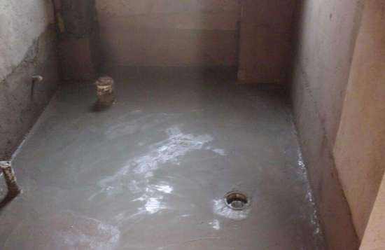 第五步、用大勺子把防水砂漿均勻地倒在地面上,然后再用刮板把防水砂漿抹均勻。