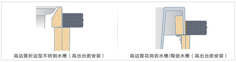 優點 相較普通臺上式安裝,水槽邊翼薄僅高于臺面 1~2mm 左右,便于清潔臺面,介于臺上和臺下之間,無需收費,安裝簡便。