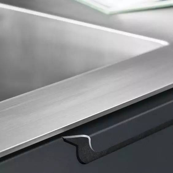 不過整版不銹鋼臺面就是另一回事,歐洲很多品牌都可以提供,一般是 10~15mm 厚不銹鋼板,有拉絲和磨砂表面。邊角都是精心倒角打磨的,搭配簡潔的柜體,那種犀利感,懸浮感,讓人愛不釋手。水槽則可以一體化焊接,當然工藝也是棒棒噠,質感可以高度統一,視覺上賞心悅目。但是價格是個坎兒,目前除了我知道的幾個進口品牌櫥柜做的跟藝術品似的,國內供應商我還在尋覓。