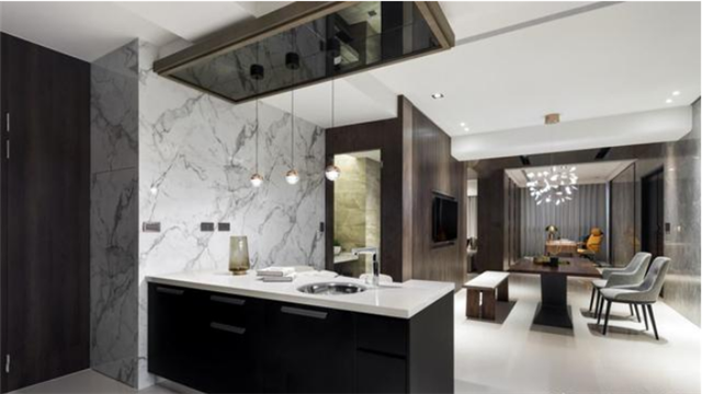 主要建材:大理石、烤漆、玻璃、栓木皮、鐵件、鍍鈦條、灰鏡