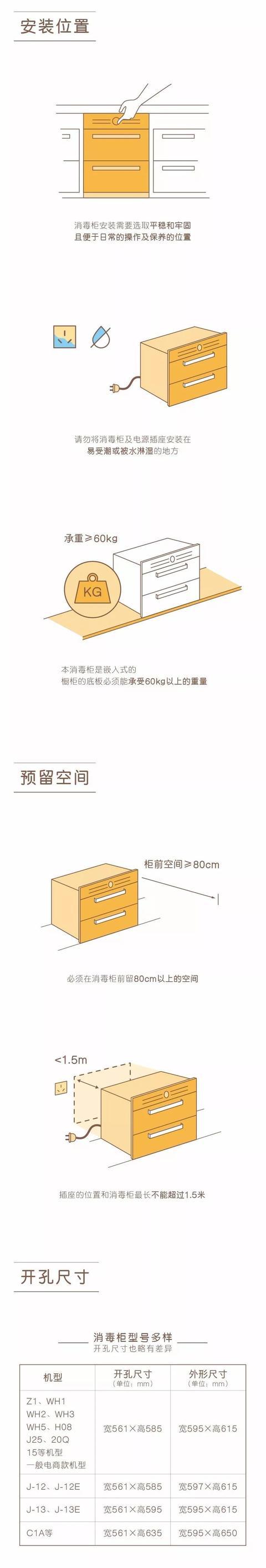 嵌入式微波爐,蒸箱,烤箱,消毒柜一般常見安裝在中柜,高柜,下柜中。在安裝前需要對(duì)櫥柜進(jìn)行開孔,這需要參考說明書上的標(biāo)準(zhǔn)開孔尺寸,除此之外還需要注意上扣以及下扣的相關(guān)尺寸。