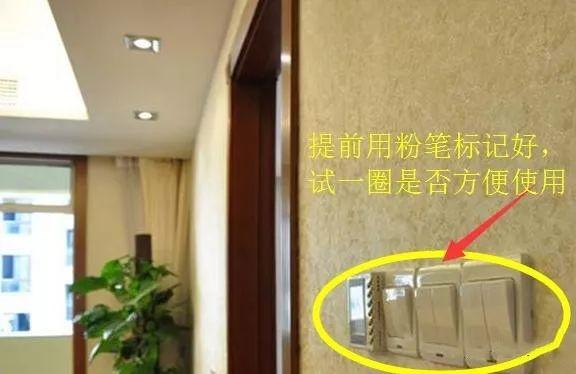 5、全屋的開關插座在安裝前就做好標記,不管是高度還是位置都要確定!自己在家里走一圈試試開關插座用起來是不是順手!插座位置高低不一,開關的位置無特殊情況都要在同一水平線!還有注意入戶燈的開關不要做到門后去了!