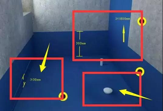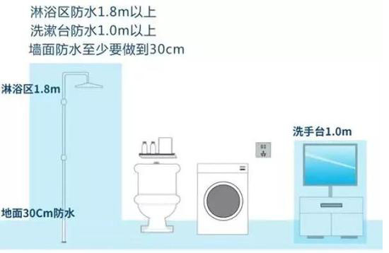 規范要求,衛生間墻面防水的高度最低為:淋浴附近1.8米,浴缸附近1.5米,洗手盆附近1.2米,其他位置0.3米。一旦忽視了防水的高度,后期容易造成墻面返潮的問題,還有造成衛生間隔壁房間的墻面陰水,很難修復。