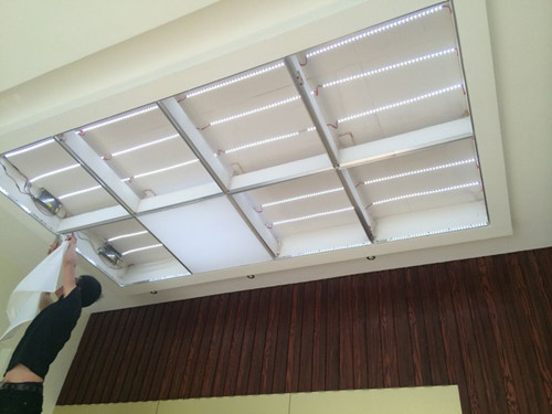 上面的步驟完成后,我們就可以開始安裝軟膜了。這里需要注意的的是,一定要保證軟膜干凈無損壞,同時無雜質和無明顯的浮塵覆蓋。首先把軟膜打開,其次用熱風炮把它充分加熱至均勻,接著用插刀把軟膜緊緊的插在鋁合金龍骨上。最后再把四周多出的軟膜修整平整就好了,修整后的軟膜天花直接提升了居室的美觀。