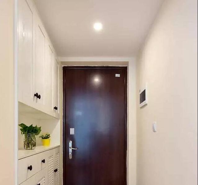 入戶進門的玄關過道,左手邊布置了到頂的內嵌式玄關鞋柜,白色柜子顯得干凈,再擺上綠植更顯清新感,讓人一進門就會覺得舒服。