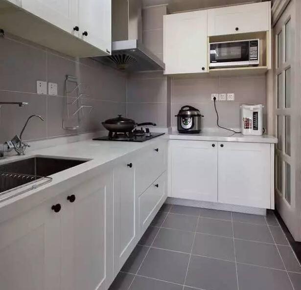 廚房,L型櫥柜全部白色裝飾,墻面和地面鋪淺灰色瓷磚,讓空間顯大,更亮堂,也耐看耐臟。