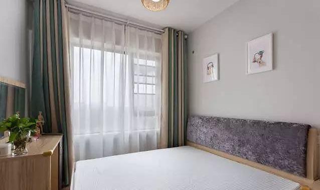 臥室,定制了一套木質家具,大床對面的小過道擺放一張梳妝臺剛剛好,墻漆的顏色很簡單,但挺清新,顏值高。