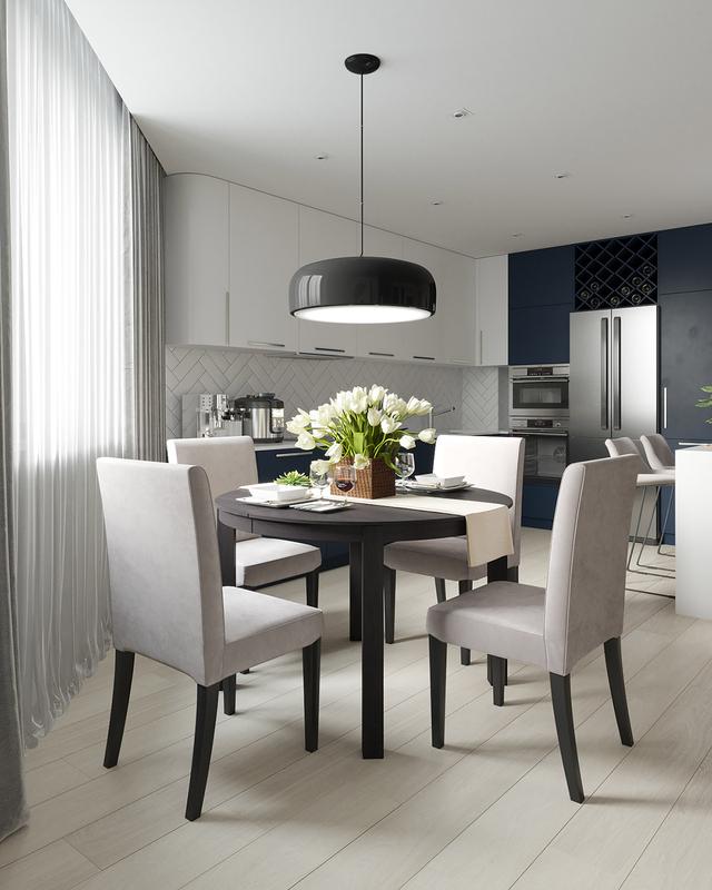 活躍的生活空間以豐富的藍(lán)色和紅色的色彩圖案為主。房間的裝飾主要是白色,深藍(lán)色的開放式廚房和電視背景墻,整體只有一副紅色壁畫點綴。