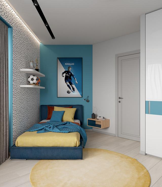 房間里的主角之一是一把深紅色的椅子,藍(lán)色電視墻的襯托下,給生活提供了一個時尚的休閑場所。平板電視漂浮在白色面板的中央,與房間的白色墻壁相呼應(yīng)。