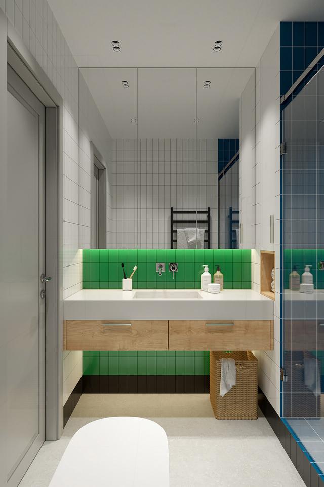 孩子的浴室裝飾是綠色,白色和藍(lán)色瓷磚的組合。自然的木材色調(diào)有助于中和活潑的色調(diào)。