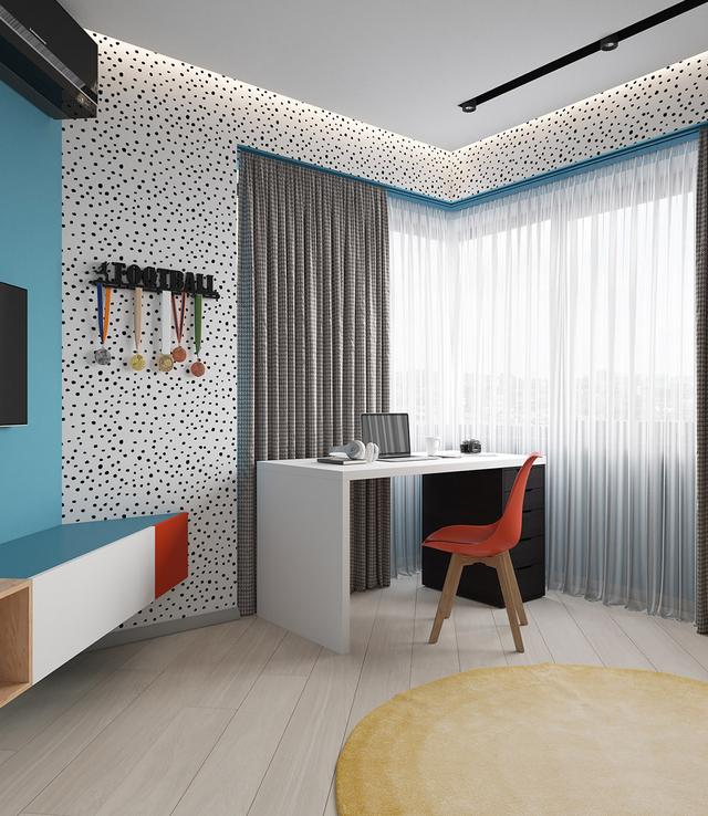 第二間臥室是孩子的兒童房,用了淺藍(lán)和黃色,還有一丟丟紅色。即便這不規(guī)則的房間也難不倒設(shè)計師。