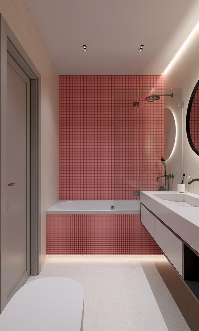 在主浴室,采用了珊瑚色和灰色兩種色調(diào)。