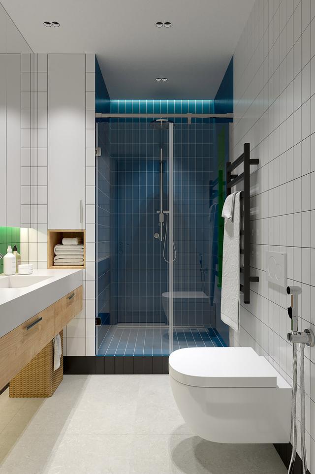 淋浴室內(nèi)的一個嵌入式儲藏角落覆蓋著綠色瓷磚,而藍(lán)色瓷磚則覆蓋了淋浴房的其余部分。白色的置物架穿透了色彩,讓人耳目一新。