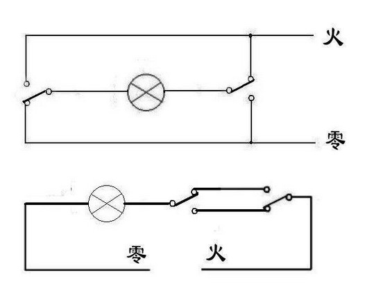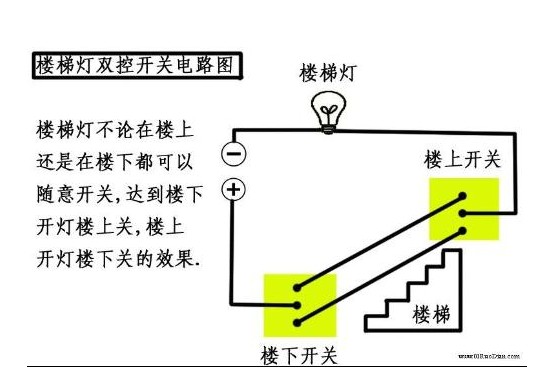 即先將一個雙控開關的中間接線柱連接到火線,再將另一個雙控開關的中間接線柱連接到燈頭(或螺口燈頭的中心舌片),然后連接來回線,也就是用兩條綠色導線任意連接上下兩個接線柱;零線則直接連接到燈頭的另一個觸點(或螺口燈頭的螺紋)這樣就完成連接了。