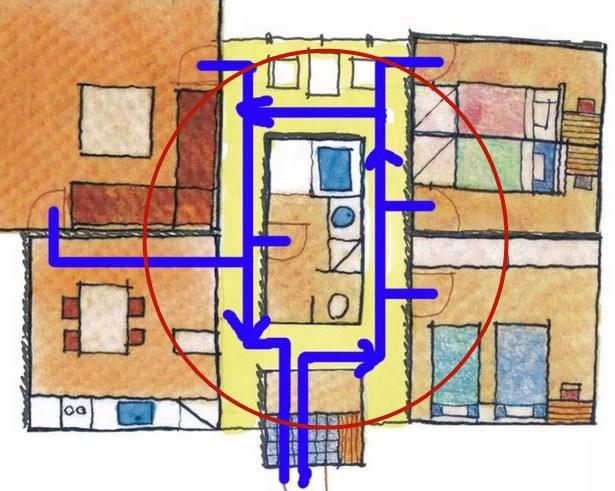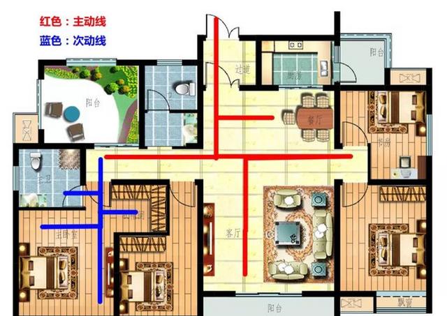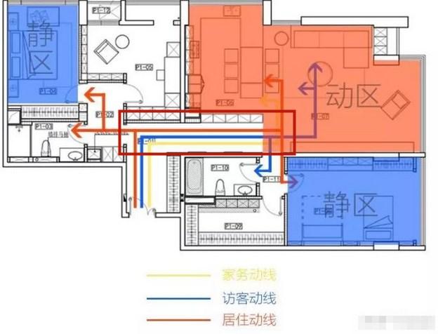 4、遵循動線設計原則改造處的洄游動線:目的是保證上述3條動線絕不交叉。如↓↓↓,不能去廚房或臥室等都得通過客廳,使其成為交叉的公共走廊。