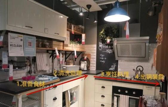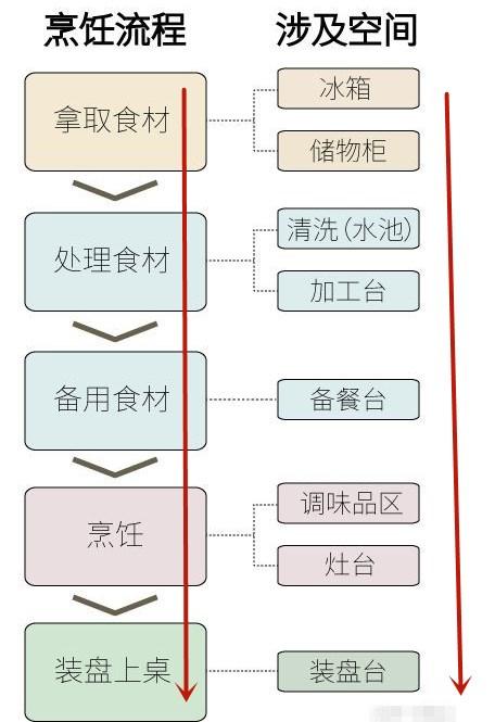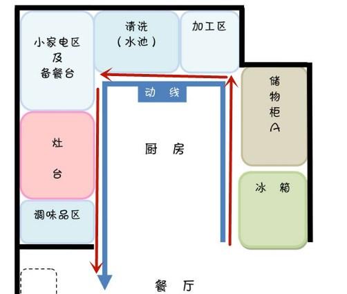 更具體布局,如L型廚房↓↓↓,進廚房是食材廚具存儲區,走1-2步就到水槽區洗菜,而再進內轉角就是到灶區燒飯菜,最終裝盤。
