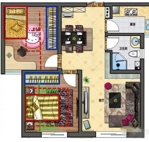 提醒:臥室必須留有夠2人并排站立的空間,不然按動線打掃衛生、移動家具時,人會連轉個身都困難異常,影響生活。