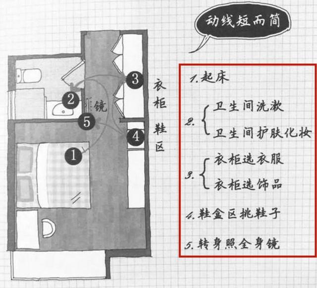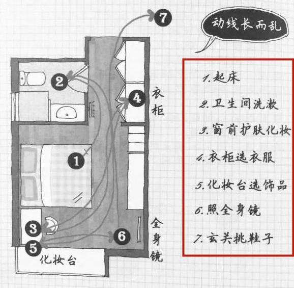 例如:錯誤動線既長又亂↑↑↑,起床到出門共7步驟,要走20米至少。